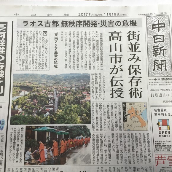 JICA, la agencia cooperativa de Japón, está trabajando para ayudar a otros países y trató de vincular 2 ciudades, Luang Phabang y Takayama. Porque la agencia piensa que Takayama tiene muchos conocimientos de preservar su casco antiguo. Takayama está de acuerdo con el proyecto que Takayama preste una ayuda en Luang Phabang para solucionar muchos problemas. Este proyecto de 2 años va a empezar a partir del próximo febrero.